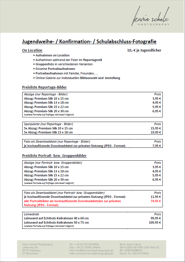Preisliste Jugendweihe 18.06.2022